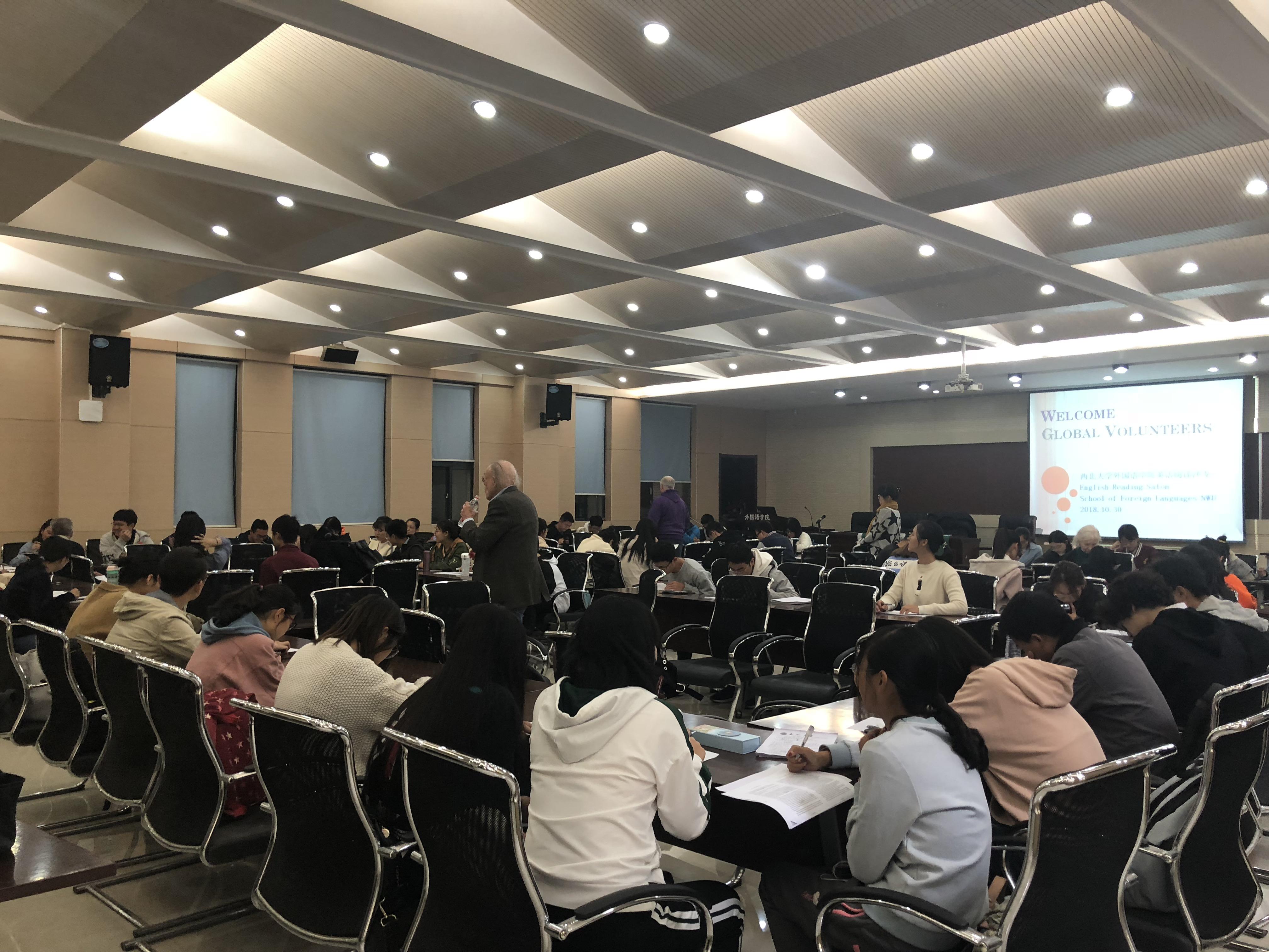 2018年10月30日下午,西北大学英语读写演讲基地阅读沙龙团队成功举办了“名师导读”英语阅读及读书有感写作比赛活动活动在我院四号楼一层高级口译实验室进行,由阅读大赛指导团队负责人张敏老师主持,阅读指导团队石岩老师协助组织,四位美国志愿者应邀和近100位学生参与了活动。
