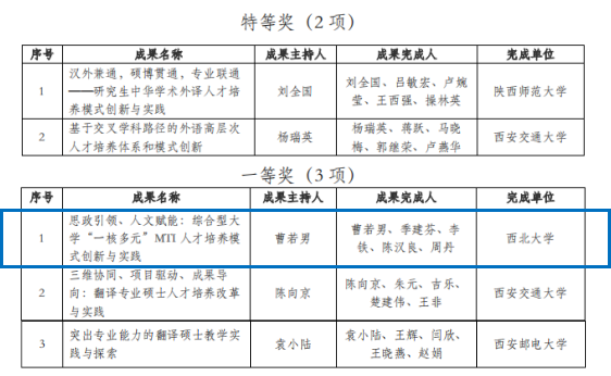 日前,陕西省学位与研究生教育学会公布了2023年陕西省外语教学成果奖评选结果,我校申报的2项教学成果全部获奖,其中我院申报的“思政引领、人文赋能:综合型大学‘一核多元’MTI人才培养模式创新与实践 ”成果获得一等奖。