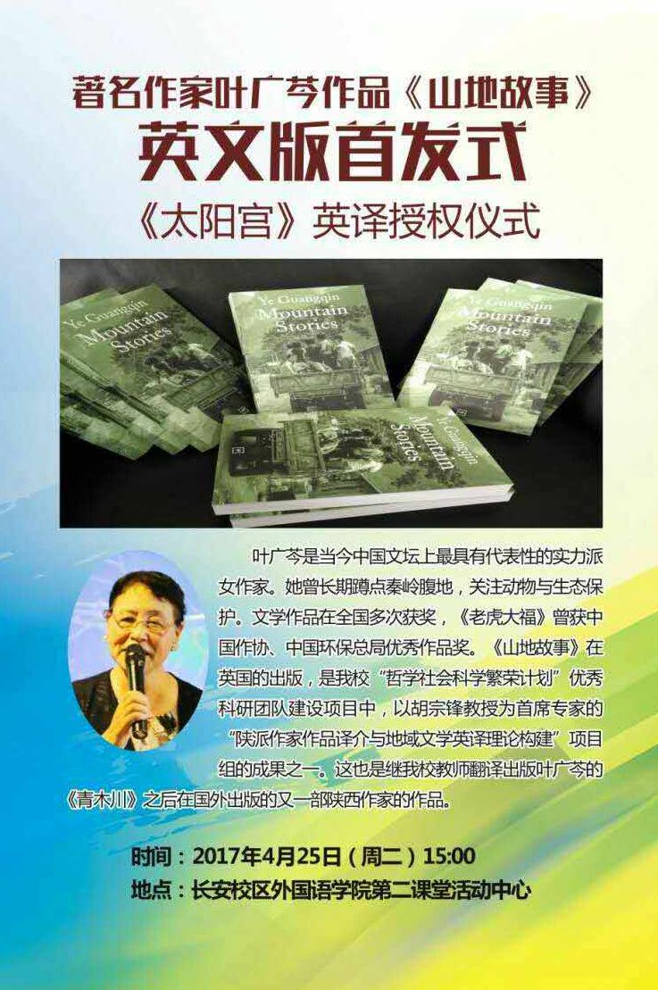 2017年4月25日下午,著名作家叶广芩作品《山地故事》英文版首发式—《太阳宫》英译授权仪式在我院举行。