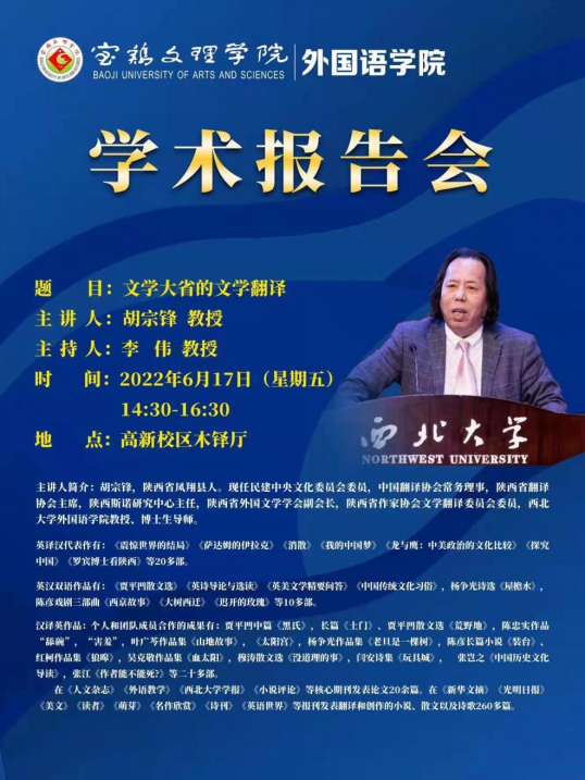 2022年6月17日,我院胡宗锋教授应邀为宝鸡文理学院师生做题为“文学大省的文学翻译”讲座,报告会由宝鸡文理学院外国语学院院长李伟教授主持。外国语学院部分教师及研究生、本科生聆听了报告。